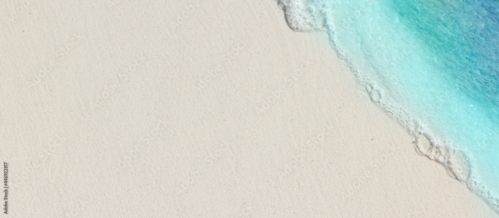 Naklejka na ściany i meble - Tropical beach background with sea waves, white sand - summer holiday background. Travel and beach vacation, copy space for text..