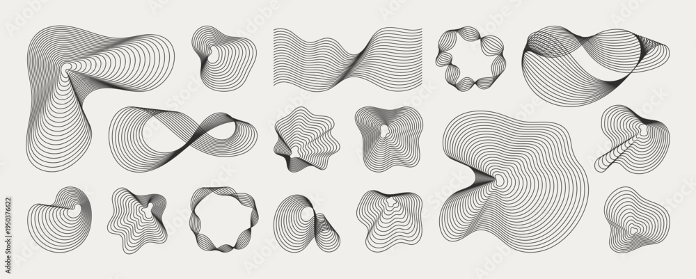Naklejka na ściany i meble - Abstract geometric line art vector set with freeform blob and contour line elements. Minimal black and white decorative shapes with wavy curves, dots, circles, and modern abstract forms for posters..