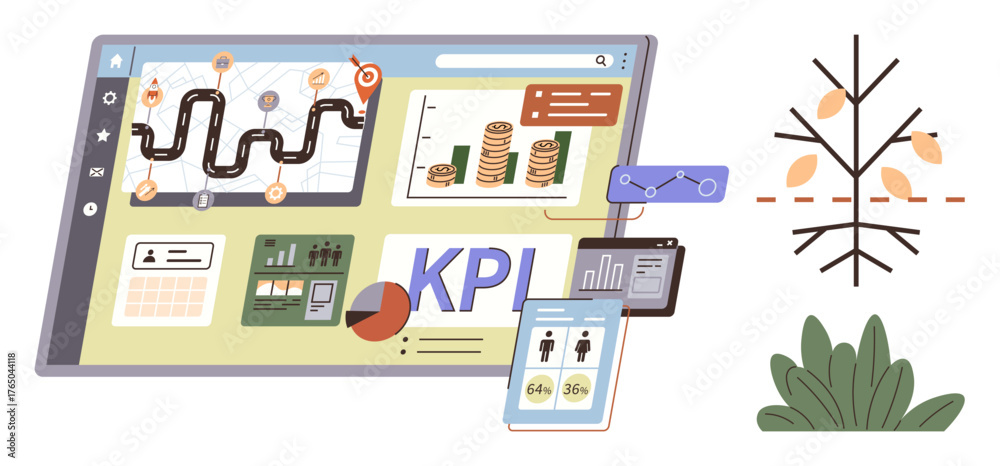 Naklejka na ściany i meble - Data dashboard with charts, financial growth metrics, KPI tracking, process map, and tree representing growth. Ideal for business success, performance tracking, strategy, analytics technology.