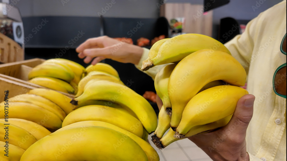 Naklejka na ściany i meble - Person shopping for fresh yellow bananas in grocery store produce section.
