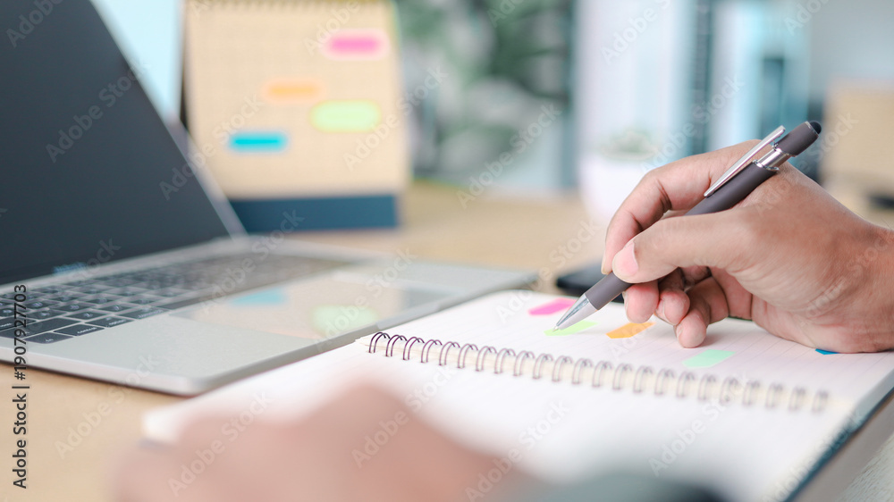 Naklejka na ściany i meble - Business professional writing task notes in notebook beside laptop with colorful sticky notes. Concept of productivity, work planning, time management, organization and modern office workflow..