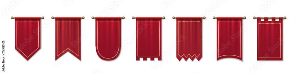 Naklejka na ściany i meble - Medieval red pennant flags set isolated on white background. Vector realistic illustration of antique textile banners with golden frames, royal sign mockups of different shape, game design elements.