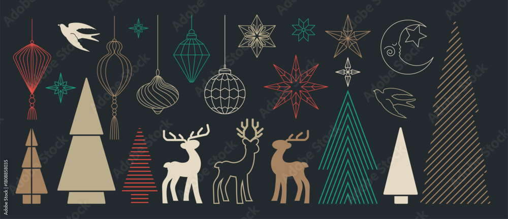 Naklejka na ściany i meble - Christmas and Happy New Year vector mid century line art illustration set with festive elements in black with gold and red tones — elegant design for greeting cards.