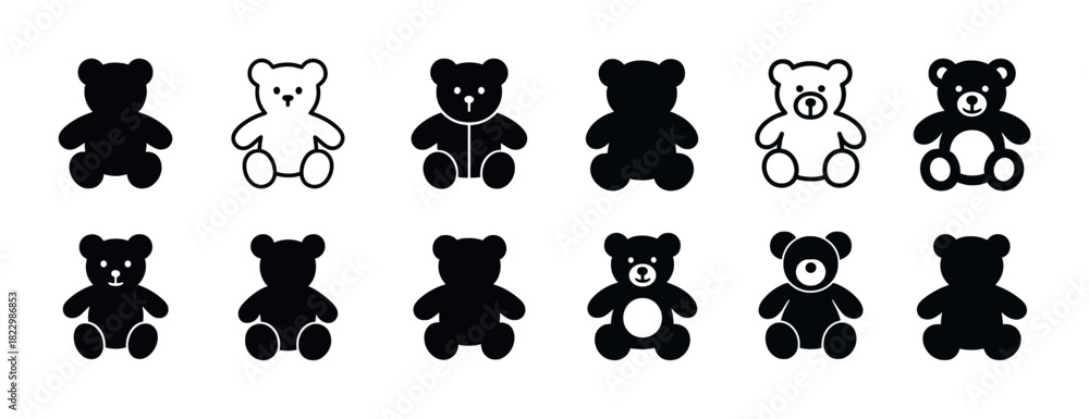 Naklejka na ściany i meble - Various black and white teddy bear icon set.