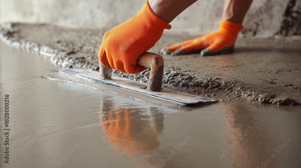 Naklejka na ściany i meble - Worker leveling wet concrete floor with trowel and wearing orange glove, symbolizing concrete leveling floor repair and surface finishing..