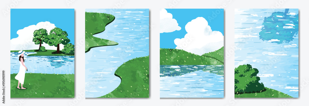 Naklejka na ściany i meble - Abstract Green Summer landscape background vector set. Nature wallpaper of green field on mountain, yellow flowers, blue sky , birds, river. Watercolor illustration for cover, wall art, decoration..