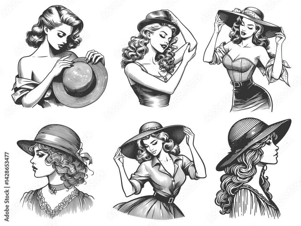 Naklejka na ściany i meble - women in retro dresses and wide-brimmed hats, vintage elegance and charm Set collection bundle sketch engraving generative ai vector illustration. Scratch board imitation. Black and white image..