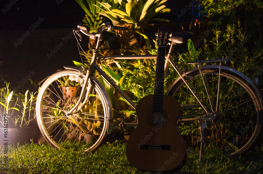 Naklejka na ściany i meble - Old Ancient Bike Park in the lawn and have a leaning guitar. Beautiful night atmosphere.