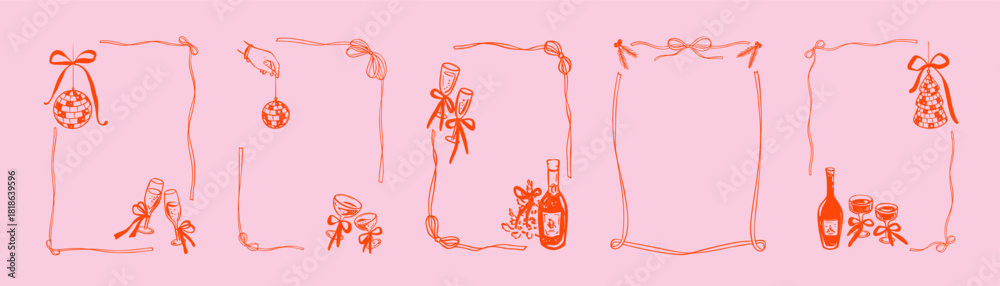Naklejka na ściany i meble - Set of red and pink coquette Merry Christmas and Happy New Year bow ribbon frames. Bachelorette disco party. Cute disco ball with a bow. Girly xmas hand drawn doodle invitation. Champagne glass.