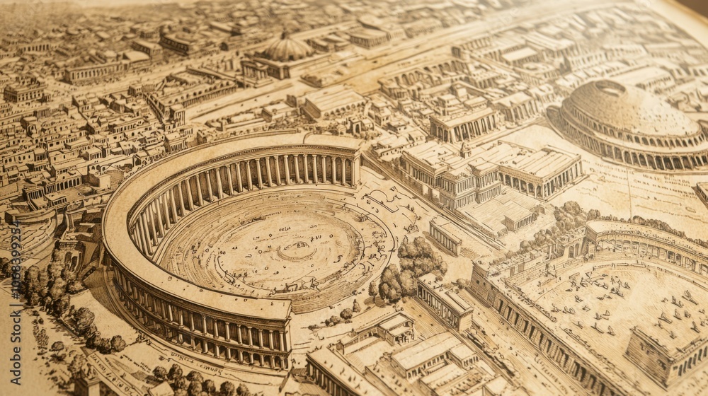 Naklejka na ściany i meble - Explore the joyful essence of ancient rome through a vintage map featuring iconic architecture and monkeys.