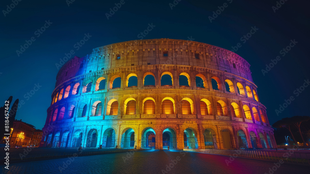 Naklejka na ściany i meble - Colosseum in Rome lit up with dynamic rainbow lighting, featuring a clear area at the bottom for text.