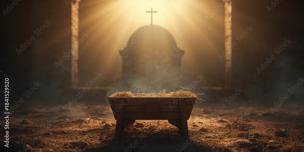 Naklejka na ściany i meble - Nativity setting with wooden manger alongside an empty tomb illustrating the purpose of the season, Easter symbolism.