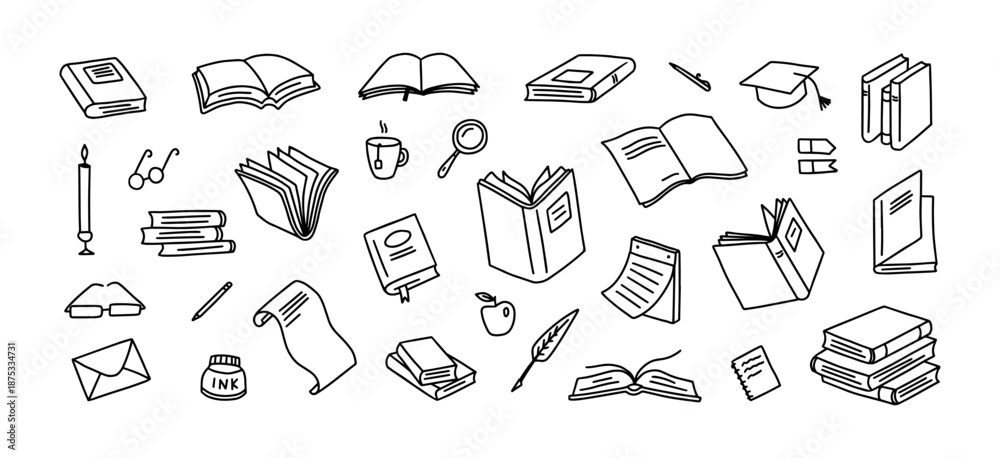 Naklejka na ściany i meble - Books doodles. Hand drawn book stacks and graduation caps for education concept, school sticker and library or learning art. Doodle symbols for reading, knowledge elements vector isolated set.