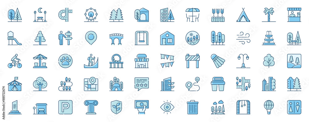 Naklejka na ściany i meble - City park web icons set in line design. Duotone pictogram pack of trees, bench, road, path, ferris wheel, street cafe, playground, direction pointer, more outline stroke signs. Vector illustration..