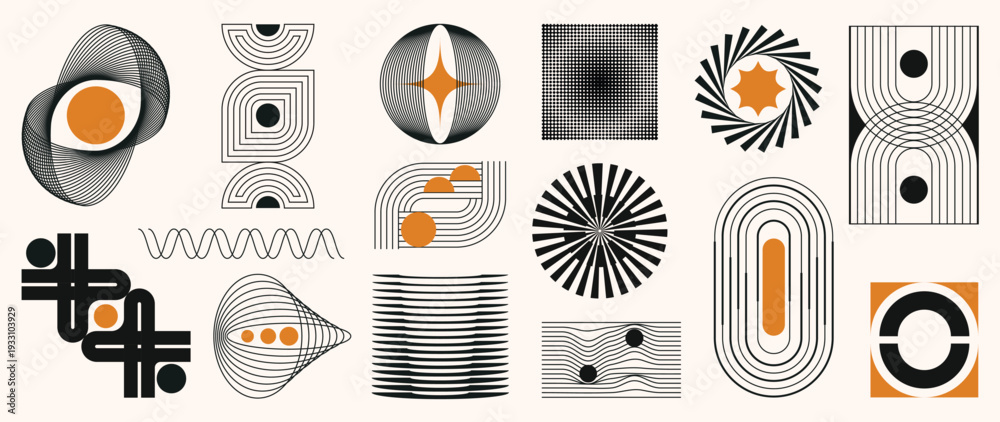 Naklejka na ściany i meble - Hand drawn abstract minimal element mid century vector set. Aesthetic contemporary stripe line art, geometric shape in monochrome. Art form design for wall art, decoration, wallpaper.