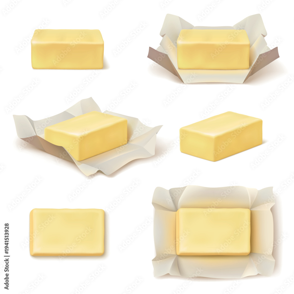 Naklejka na ściany i meble - Realistic butter block. 3d margarine stick open wrapping package, spread bar cheese slice cream piece dairy milk product breakfast cooking food isolated garish vector illustration.