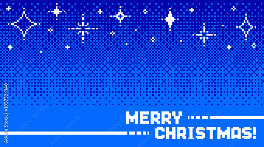 Naklejka na ściany i meble - Merry Christmas pixel art pattern with pixelated stars on blue background. Retro 8-bit video game style digital greeting card..