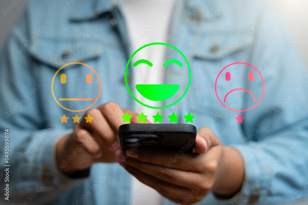 Naklejka na ściany i meble - Happy customer providing 5-star review via mobile application after receiving outstanding service and quality product. Online customer feedback plays crucial role in business ranking, Consumer trust.