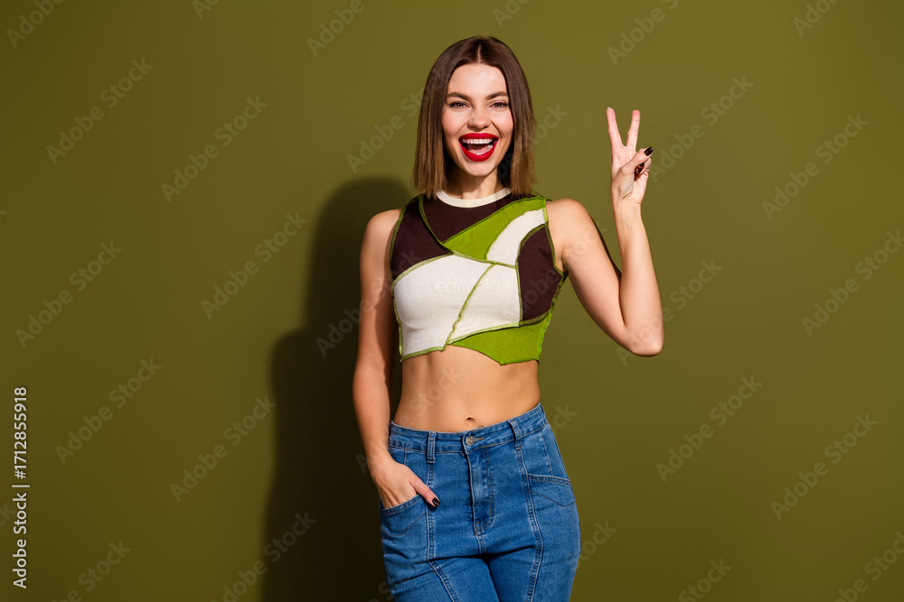 Naklejka na ściany i meble - Young fashionable woman making peace sign against olive green background, wearing trendy top and denim jeans, smiling confidently.
