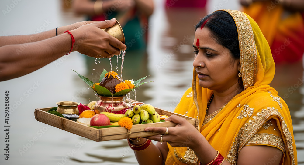 Naklejka na ściany i meble - Chhath Puja Celebration: Woman offering prayers to Sun God, India.