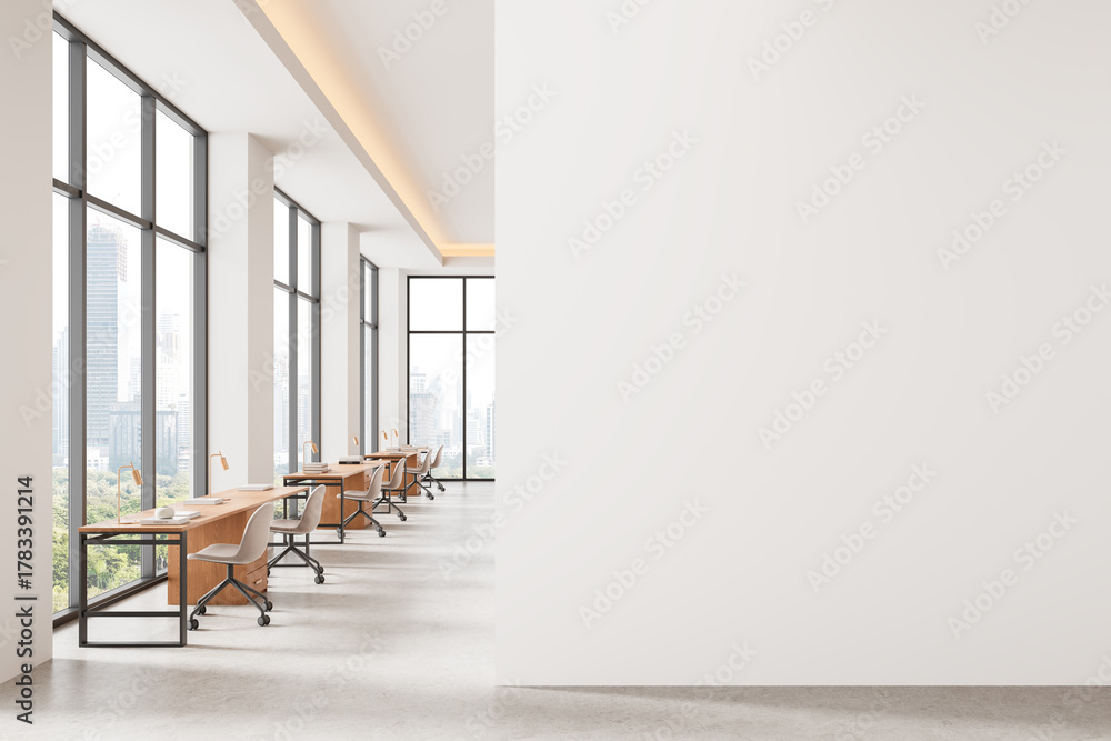 Naklejka na ściany i meble - Modern office interior with large windows and empty white wall for poster or canvas mockup presentation in bright minimalist design concept layout. 3D Rendering.