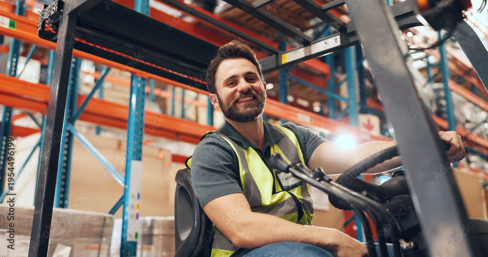 Naklejka na ściany i meble - Confidence, forklift and man with portrait in warehouse, industrial logistics and inventory management. Flare, freight industry and worker with vehicle for stock distribution, smile and storage depot.