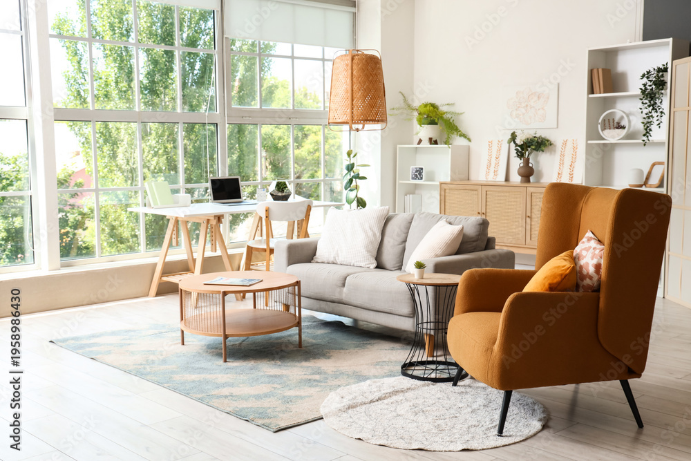 Naklejka na ściany i meble - Interior of stylish living room with sofa, tables and paintings.
