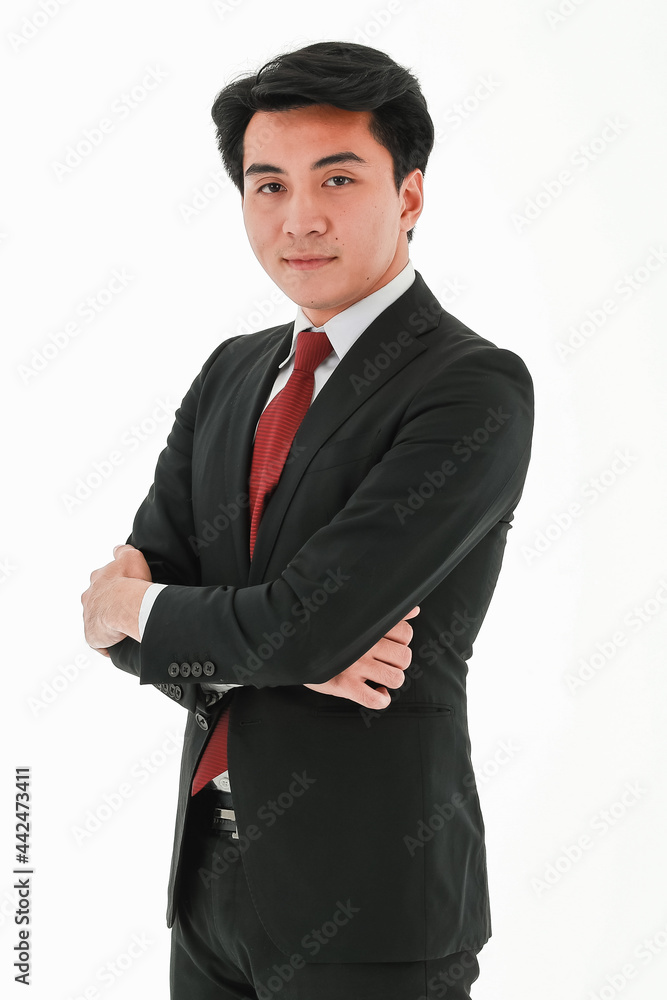 >Obrazy na płótnie Canvas>Portrait of successful professional asian businessman in formal style black suit, red tie, white shirt, little smile, standing with crossed arms on white background, looking straight at the camera