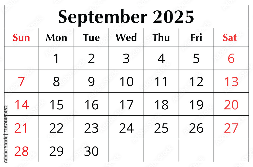 Obraz na płótnie Canvas - September 2025 ENGLISH month calendar. png transparent illustration.