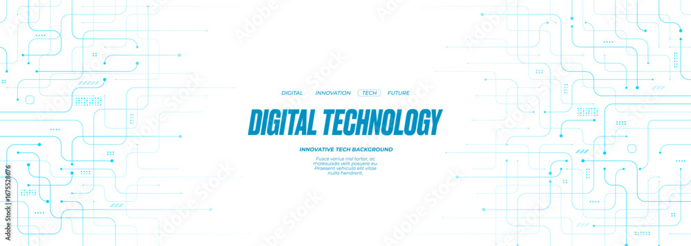 Obraz na płótnie Canvas - Tech banner with flowing lines and circuit patterns. Digital background featuring abstract network connections and futuristic design elements in blue and white. Technology banner backdrop.