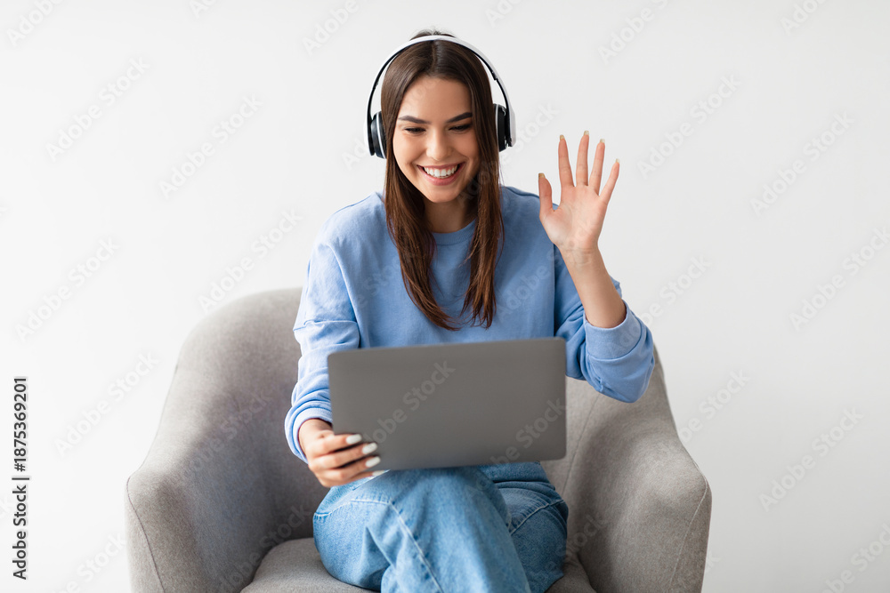 Obraz na płótnie Canvas - Distant virtual communication concept. Pretty young lady in headphones waving at laptop screen, sitting in armchair, making video call, chatting online on white studio background.