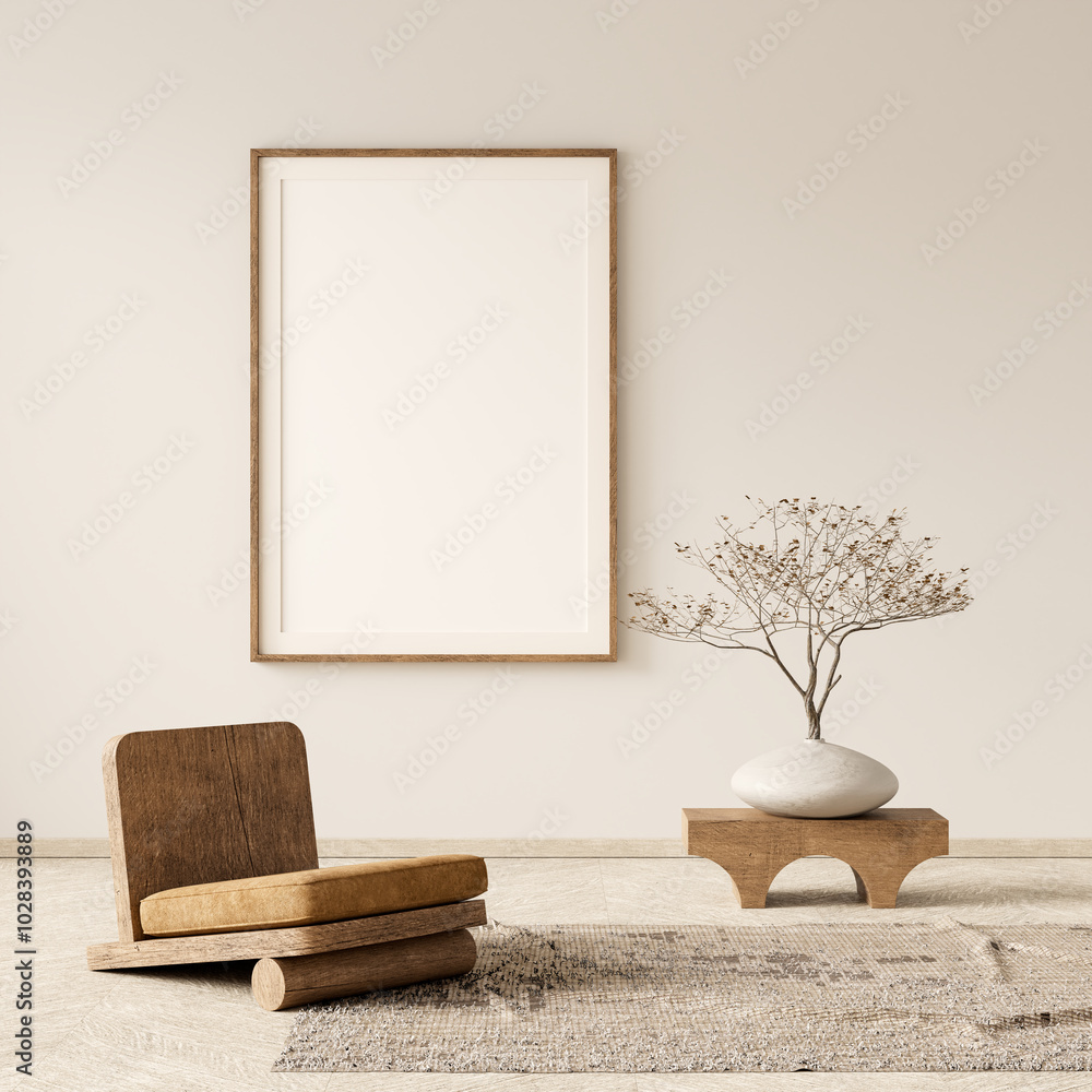 Obraz na płótnie Canvas - Mock up poster frame in boho style decorated livinig room. Modern, authentic Interior design of living room with wooden furnitures. 3D illustration.