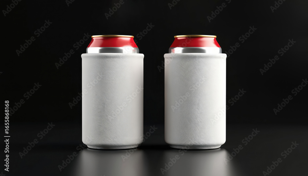 Obraz na płótnie Canvas - Two blank white collapsible beer koozies shown in side view against dark background. Neoprene beverage holders perfect for custom branding, clean, minimalist design for cans, bottles, soda pop..