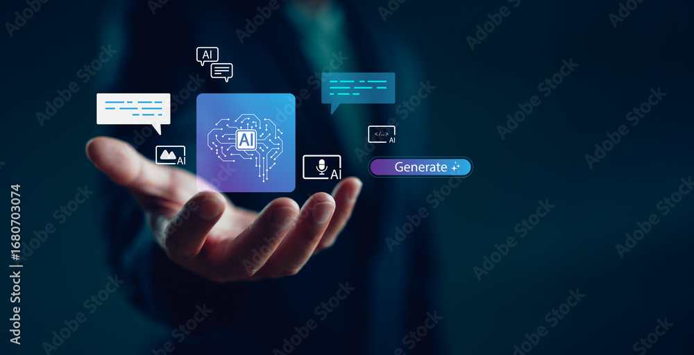 >Obrazy na płótnie Canvas>Wybrane motywy - zobacz więcej !>Słoń>Businessman presenting AI technology icons, including chatbot, voice assistant, and image generation, symbolizing artificial intelligence, innovation and digital transformation in modern business.