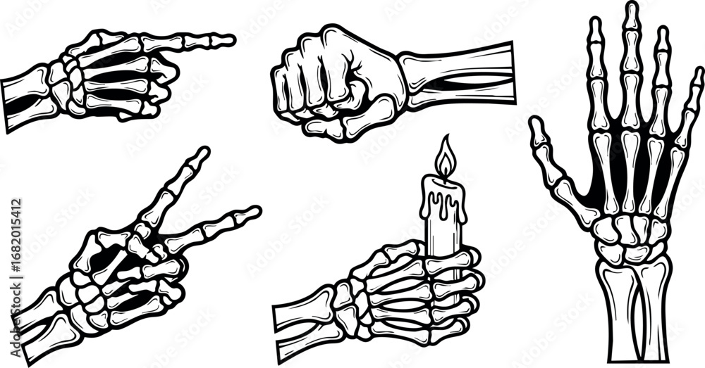 Obraz na płótnie Canvas - Skeleton hand gestures and poses vector illustration with candle and fist .