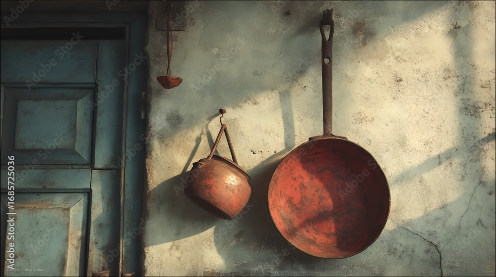 >Obrazy na płótnie Canvas>Wybrane motywy - zobacz więcej !>Słoń>Rustic red and copper cookware hanging on weathered plaster wall with natural window light casting shadows for vintage kitchen decor editorial and home living design inspiration.