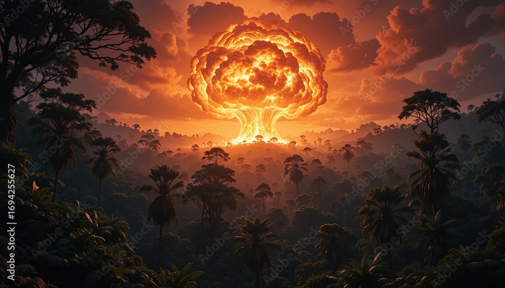 Obraz na płótnie Canvas - Dramatic explosion over lush jungle landscape at sunset creates impactful contrast and evokes themes of power and destruction.