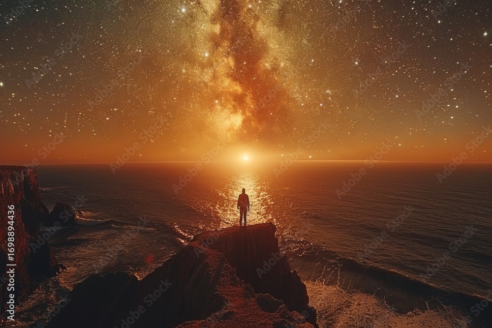 Obraz na płótnie Canvas - Sunset over ocean with galaxy backdrop viewed from a cliff in serene twilight.