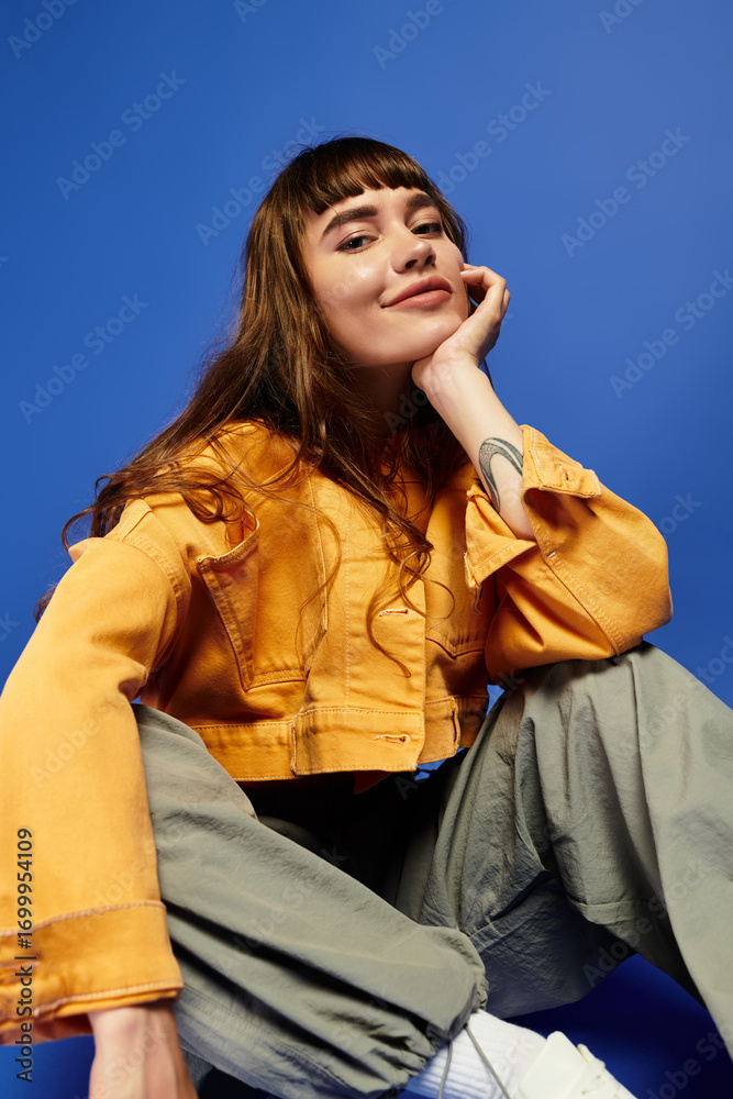 Obraz na płótnie Canvas - Stylish young woman in vibrant attire poses against a striking blue backdrop with confidence.