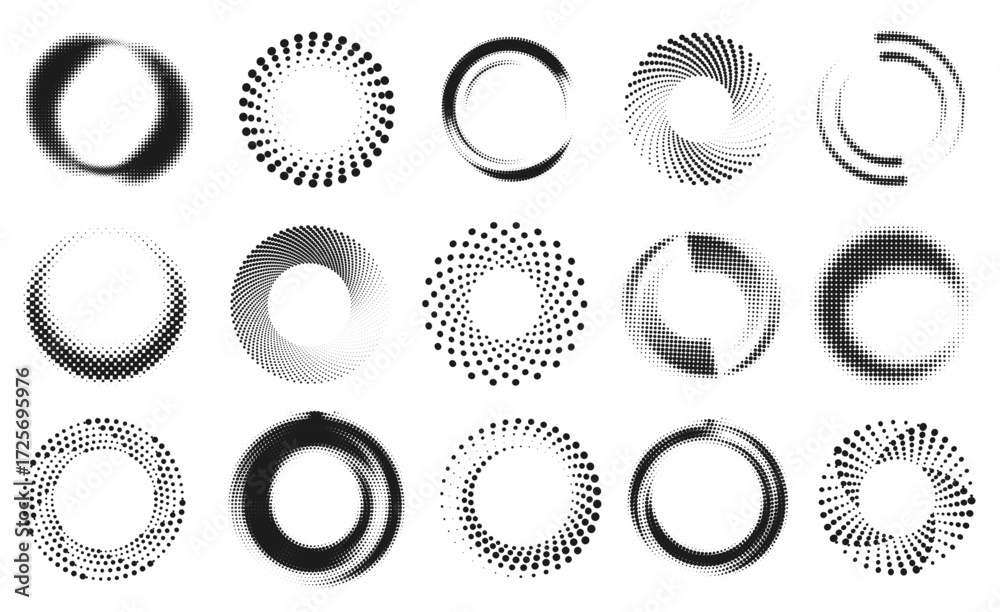 Obraz na płótnie Canvas - Halftone circular frames. Abstract dotted circle borders, round gradient rings and blurred swirl radial shapes with geometric half tone effect. Retro dotwork frame vector set.