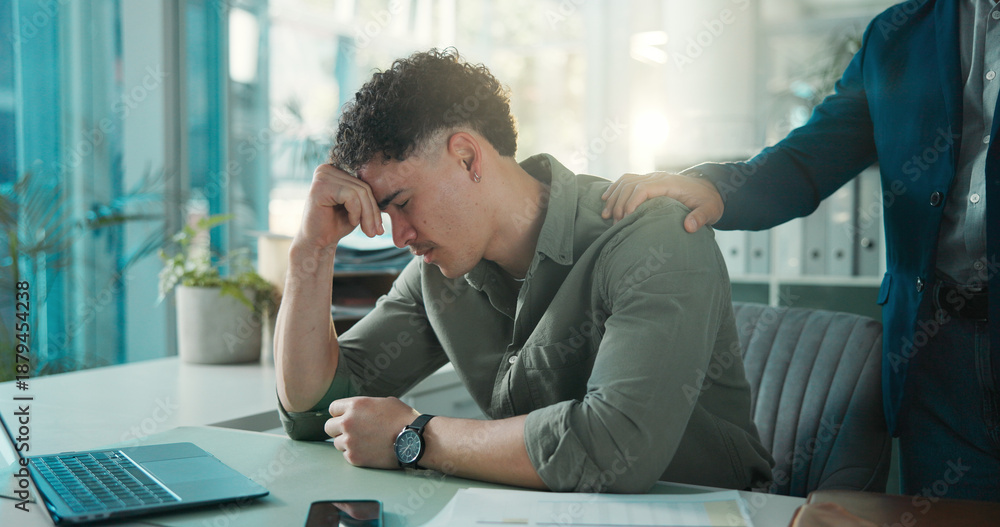 >Obrazy na płótnie Canvas>Wybrane motywy - zobacz więcej !>Słoń>Man, sad and comfort in office, stress and thinking of unemployment, emotional and financial crisis. Employee, unhappy and person with depression for job loss and coworker with empathy for dismissal
