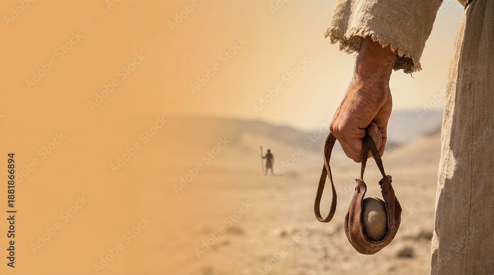 Obraz na płótnie Canvas - Man holding a slingshot with stone, facing a distant figure in a desert landscape. Biblical story of David and Goliath..