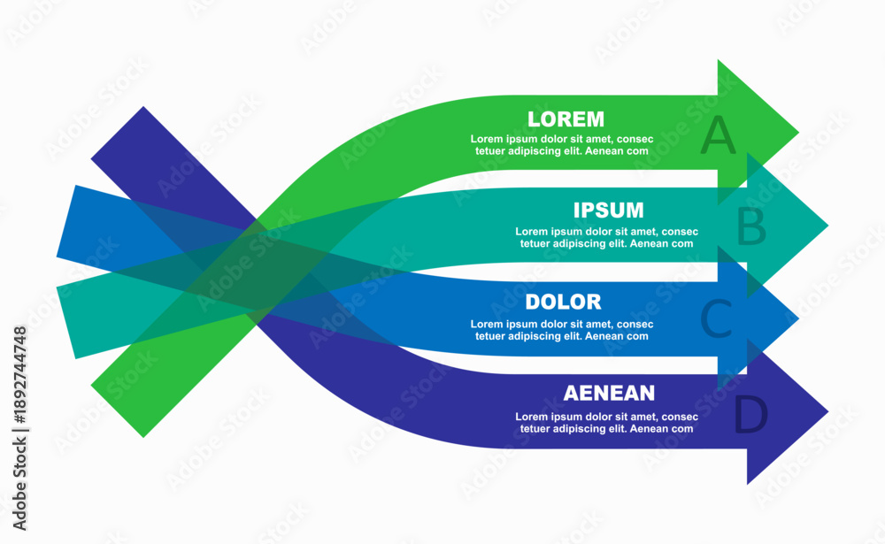 Obraz na płótnie Canvas - Modern multi-arrow infographic with overlapping ribbons, featuring placeholder text and clean vector design. Vector illustration..