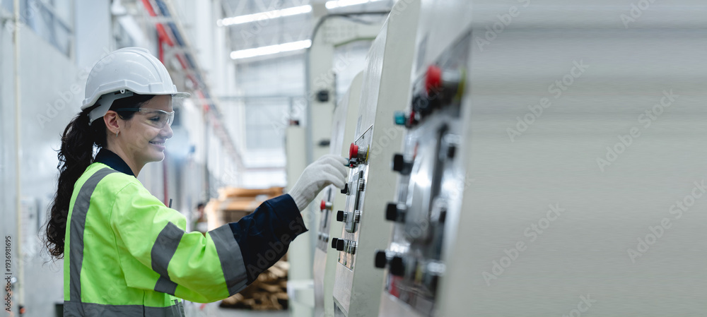 >Obrazy na płótnie Canvas>Wybrane motywy - zobacz więcej !>Taniec>Caucasian female factory technician wearing safety helmet, gloves, goggles and reflective vest operating industrial machine using control panel in cardboard packaging factory production line.