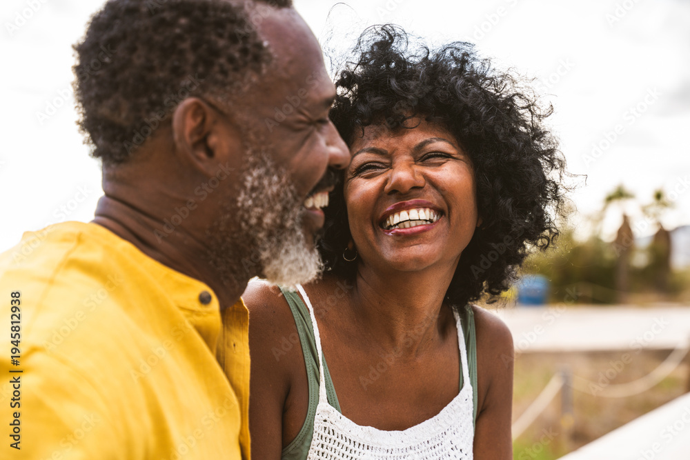 Obraz na płótnie Canvas - Beautiful mature black couple of lovers dating at the seaside - African senior man and woman bonding outdoors at summertime.