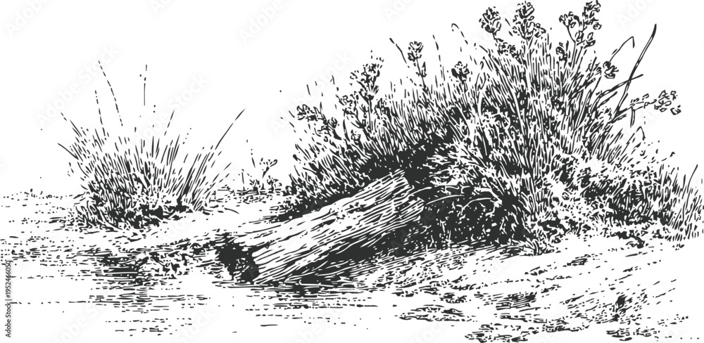 Obraz na płótnie Canvas - Natural landscape with log and bushes by a water edge, vintage ink drawing of rustic riverside scene.