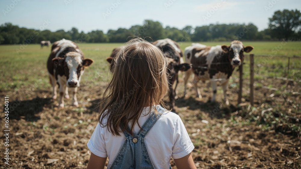 Obraz na płótnie Canvas - Back view of a joyful kid observing farm animals and cattle on a sustainable agriculture site.