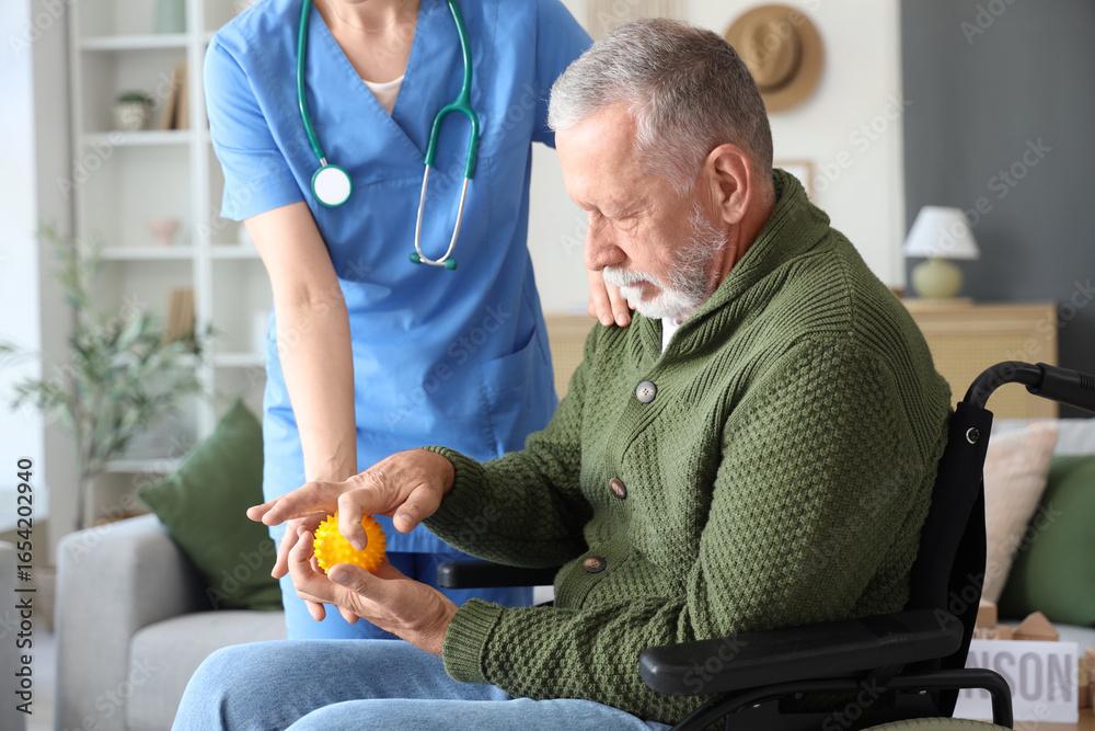 Obraz na płótnie Canvas - Senior man suffering from Parkinson syndrome in wheelchair with massage ball and nurse at home.