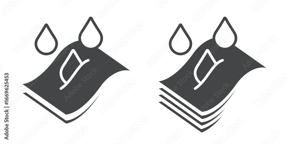 Obraz na płótnie Canvas - Material fiber absorption water drops icon vector simple bold solid graphic illustration set, diaper cloth layers absorbency level pictogram sign symbol, waterproof textile structure sheets technology.