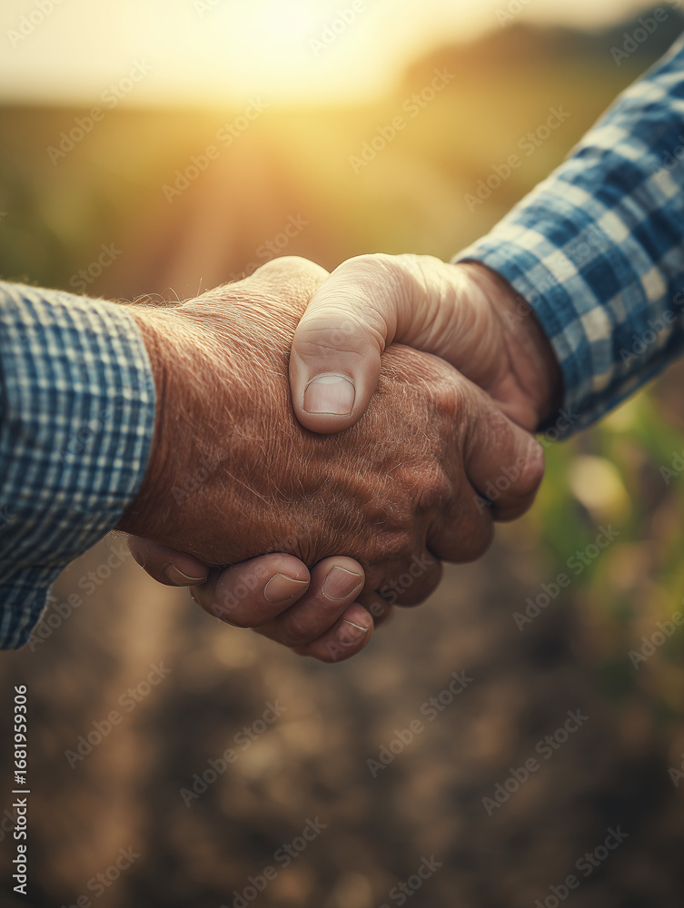 Obraz na płótnie Canvas - Two farmers shaking hands in cultivated field at sunset.